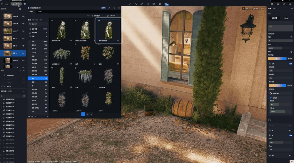 在“素材库-模型-自然-藤本”分类下,提供了参数化藤蔓素材,包括爬山虎、月季、金边常春藤等。
