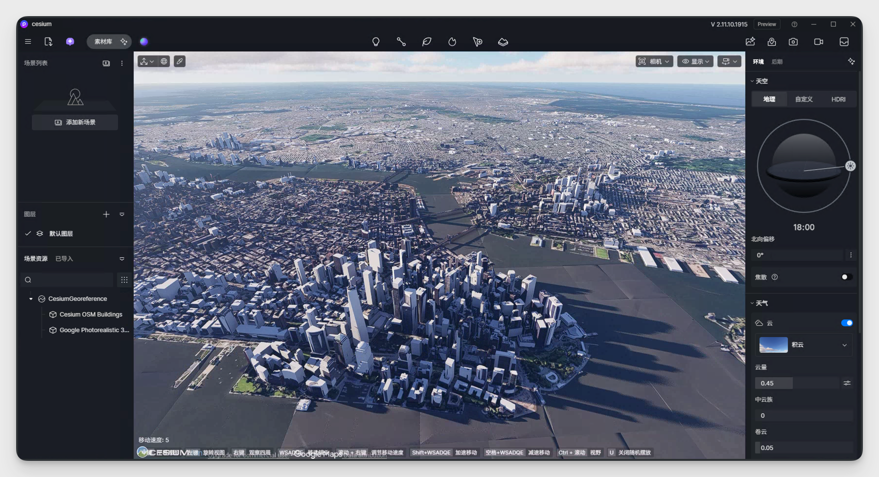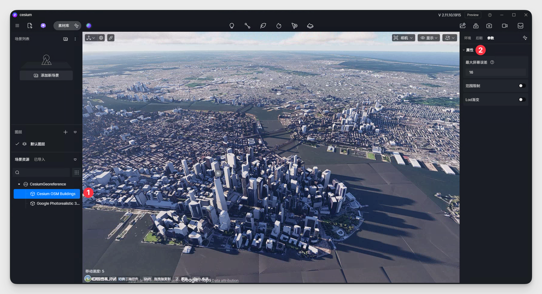 选择 Cesium OSM Buildings 和 Google Photorealistiv 3D Tiles 数据源导入后的效果