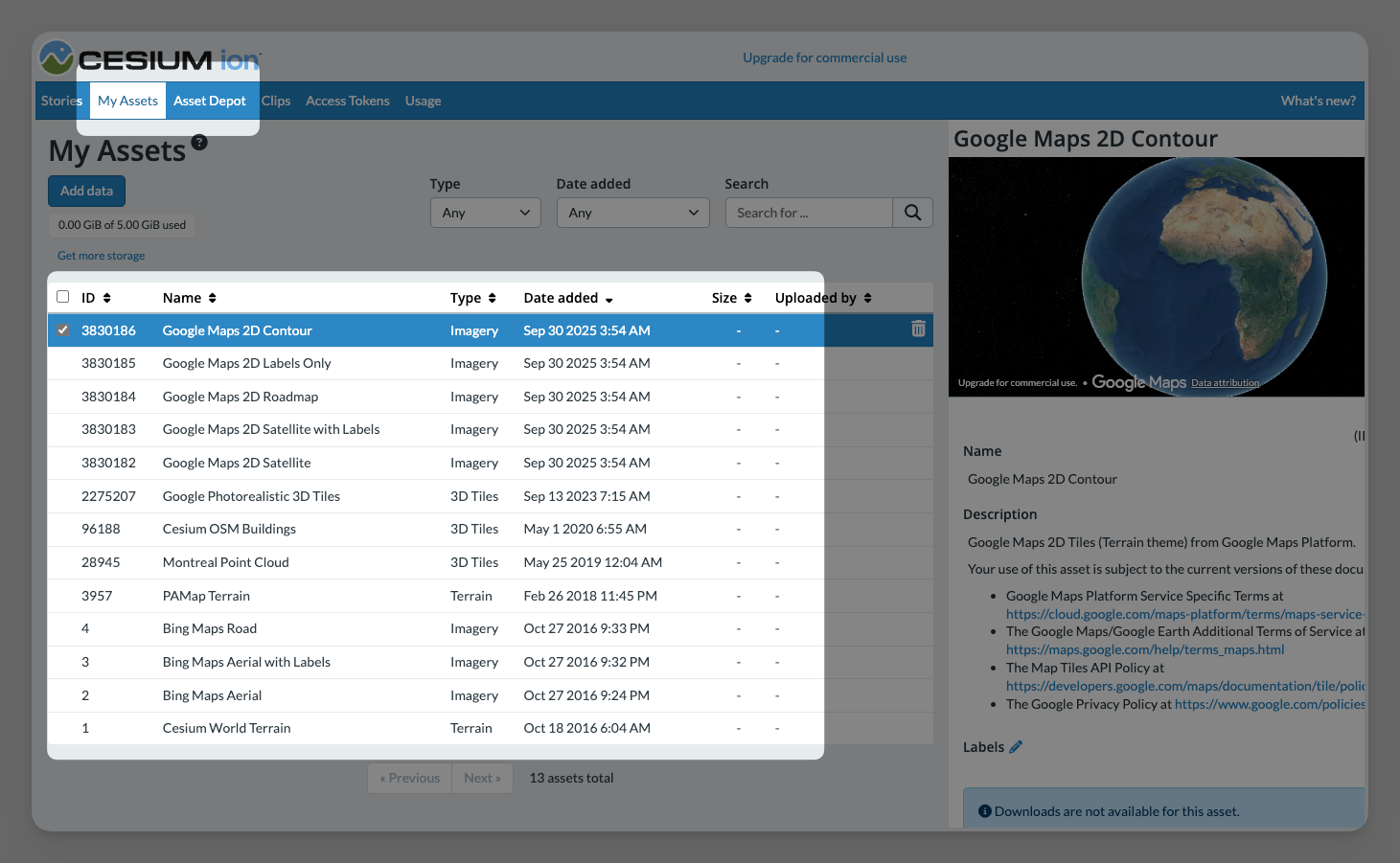 My Assets页面。这里显示了您账号下可用的地理信息数据资产。您可以上传自己的测绘数据(中国大陆用户请勿上传)。也可以在Asset Depot中添加官方提供的免费全球基础数据。