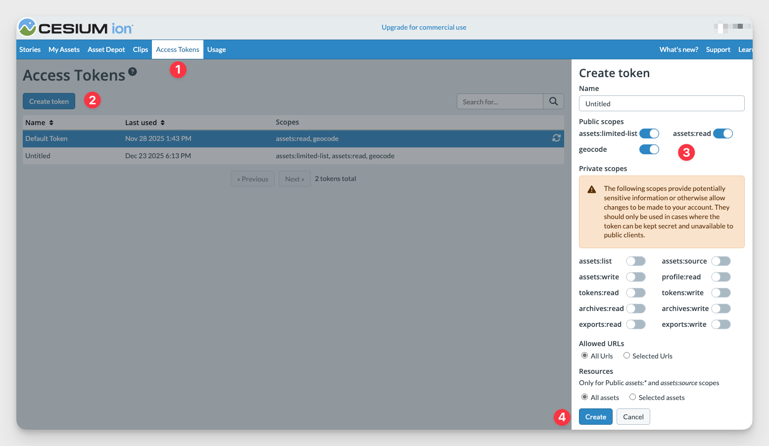 无论是个人用户还是团队用户,首先都需要拥有一个 Cesium 账号并获取 Access Token(访问令牌)。