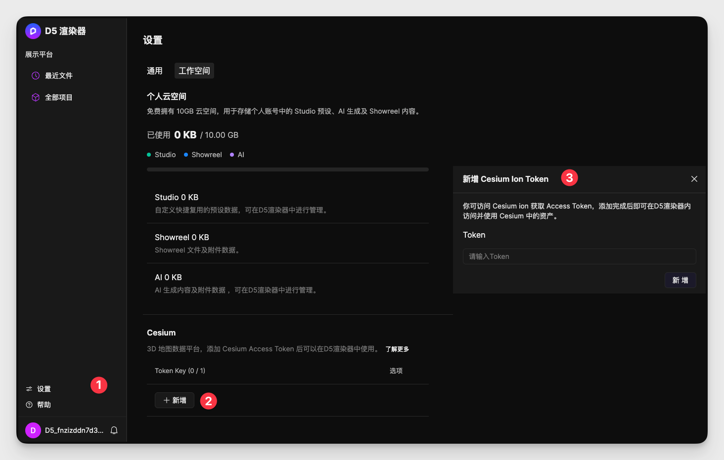 地形-Cesium并点击设置Token或 直接使用您的D5账号登录登录D5 MySpace并前往设置-工作空间的 Cesium 设置项。 - 点击