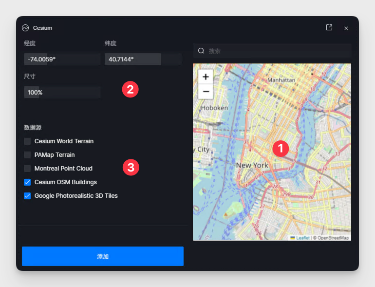 - 选择数据源:勾选您希望添加至D5场景的数据类型(如:Google Photorealistic 3D Tiles 建筑模型 + Cesium OSM Buildings 建筑模型)。