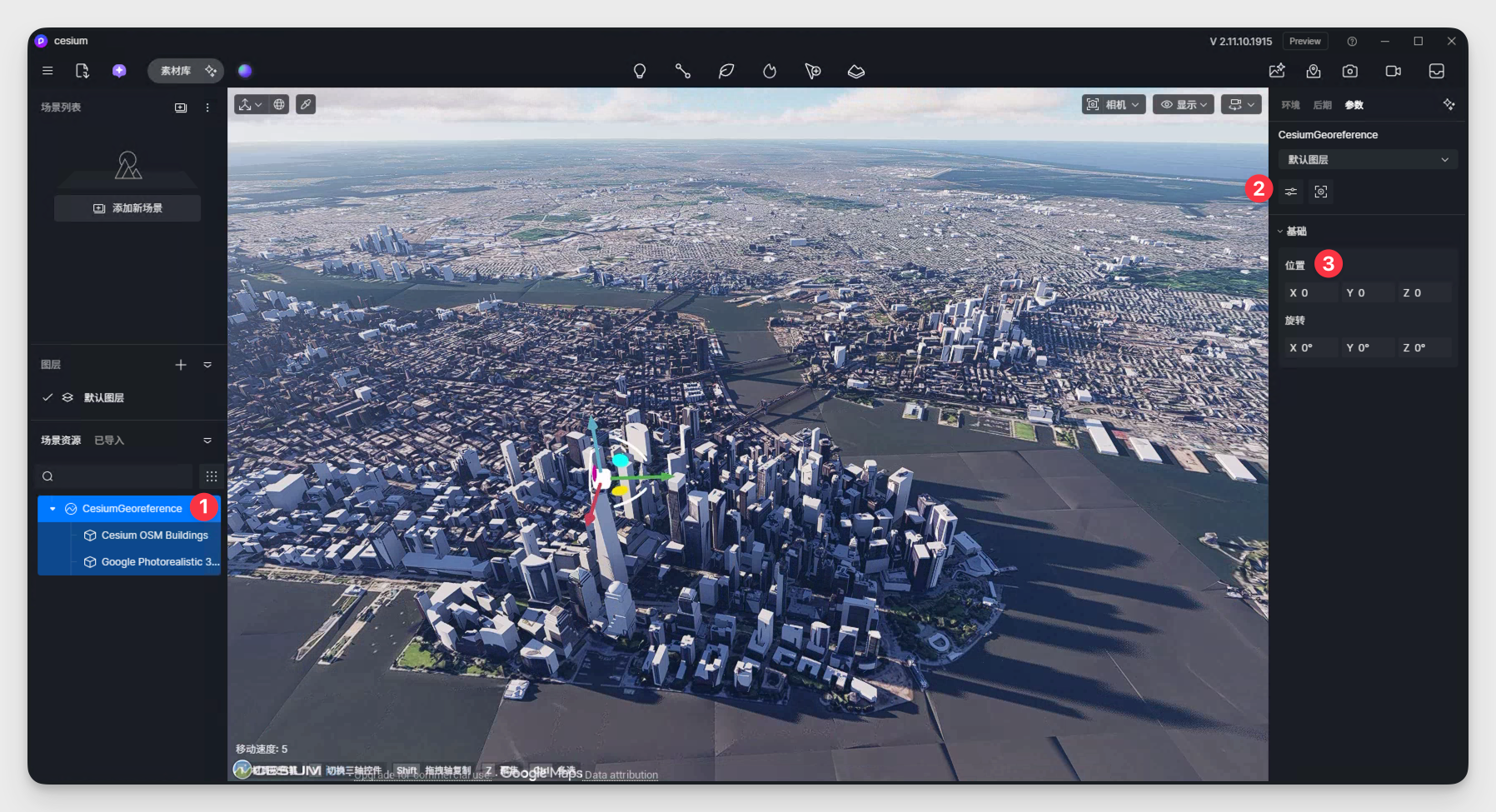 - 点击左侧场景资源列表中的 CesiumGeoreference