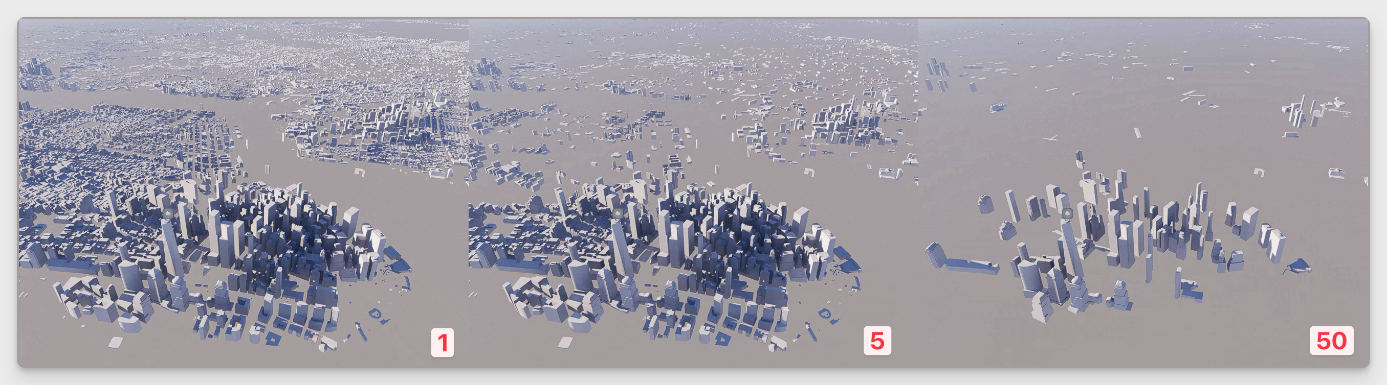 Cesium OSM Buildings 数据源在最大屏幕误差分别设置为1、5、50时的效果