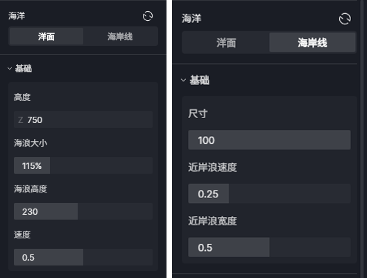- 高度:可手动调整海平面的整体高度,用于匹配场景地形。
