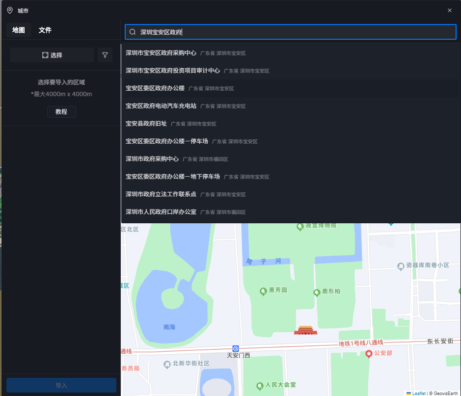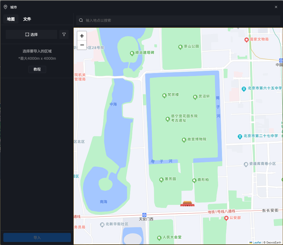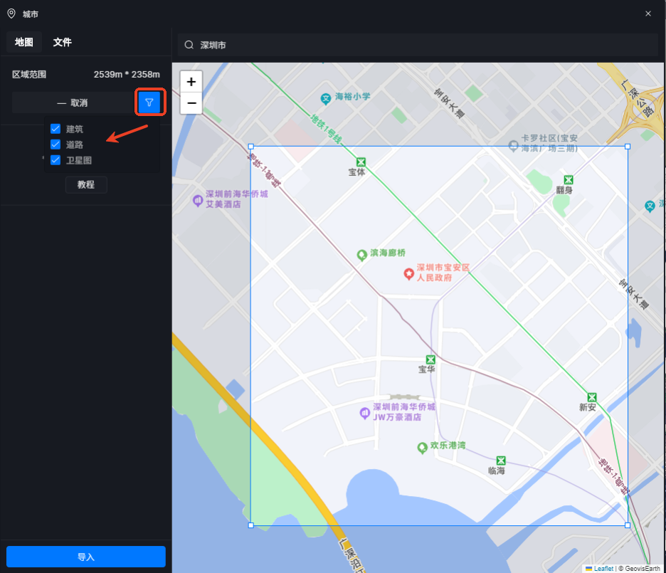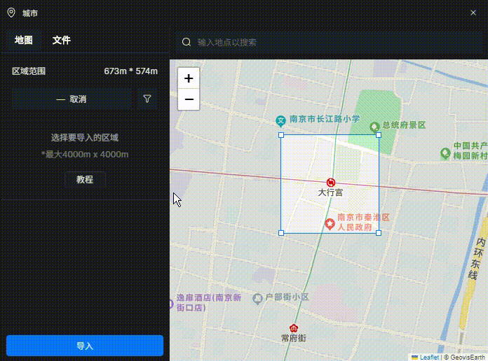 - 主界面顶部菜单栏-地形按钮新增下拉菜单,新增“城市”选项。点击后在弹出的窗口中可以选择.shp文件导入(支持多选),上传的单个文件最大为10MB;