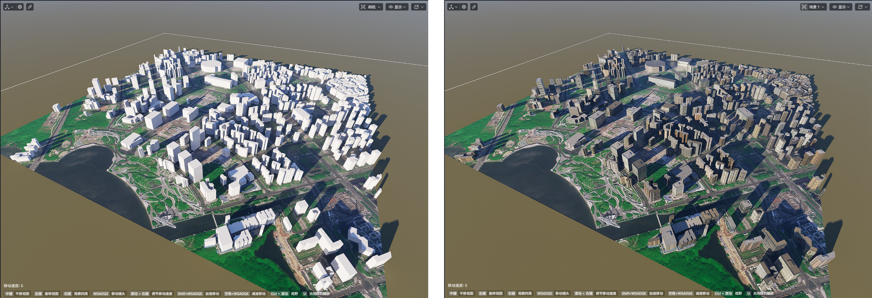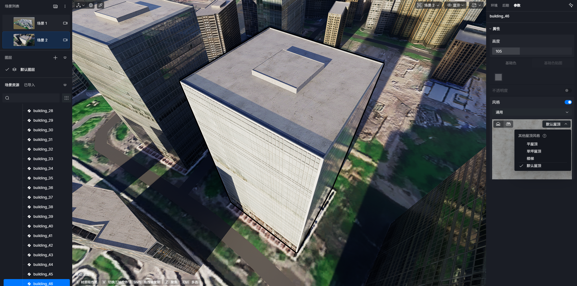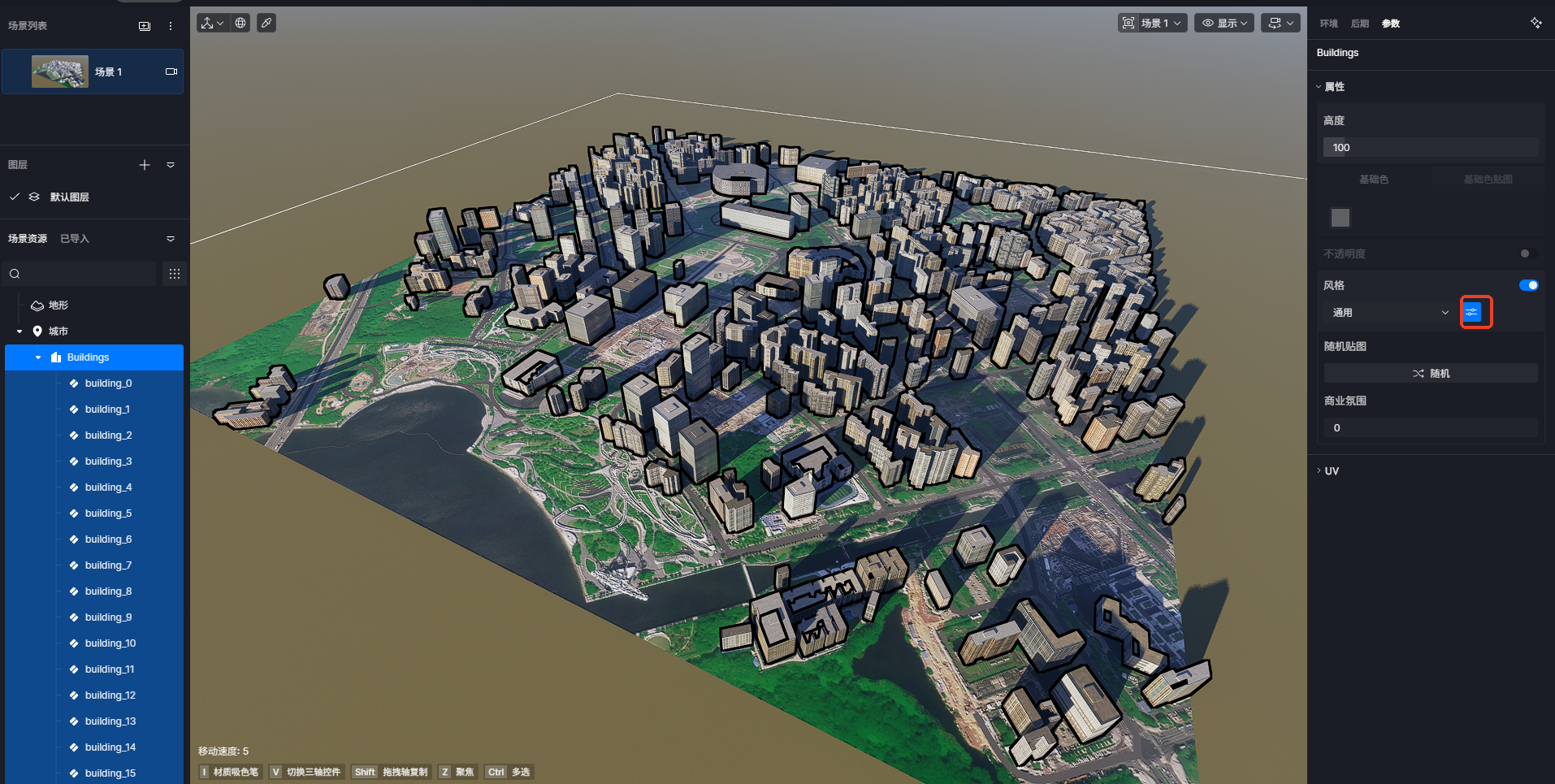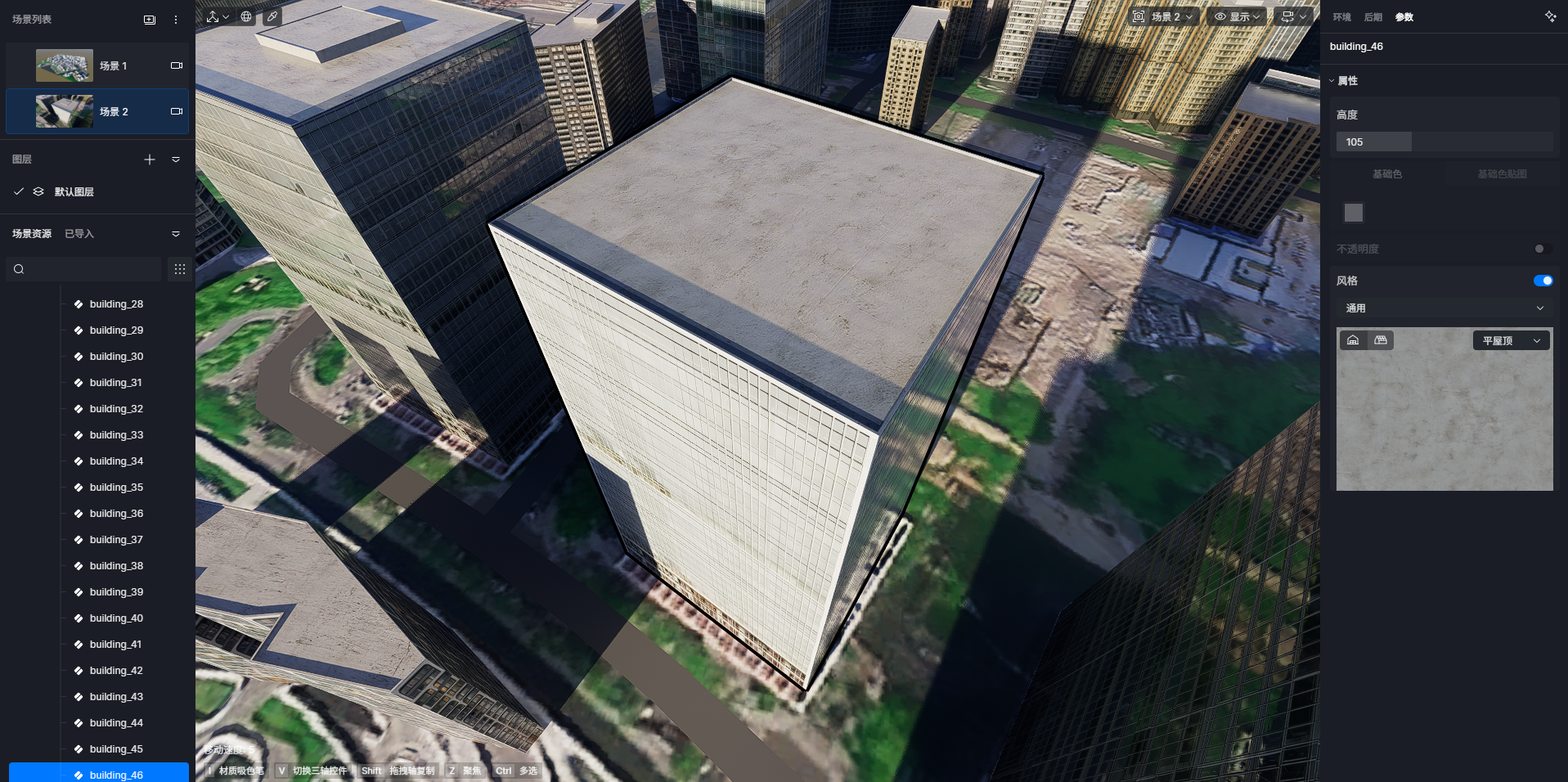 如您所见,您所导入的城市最多有三个层级,分别是城市、建筑组/道路组/卫星图/地面、单个建筑/单条道路。当您选中不同层级时您可以对不同的参数进行调整,接下来,我们将在白模和建筑风格两个模式下进行详细介绍。