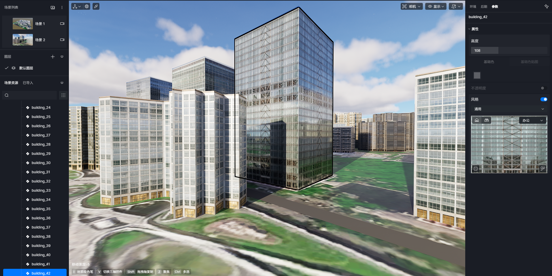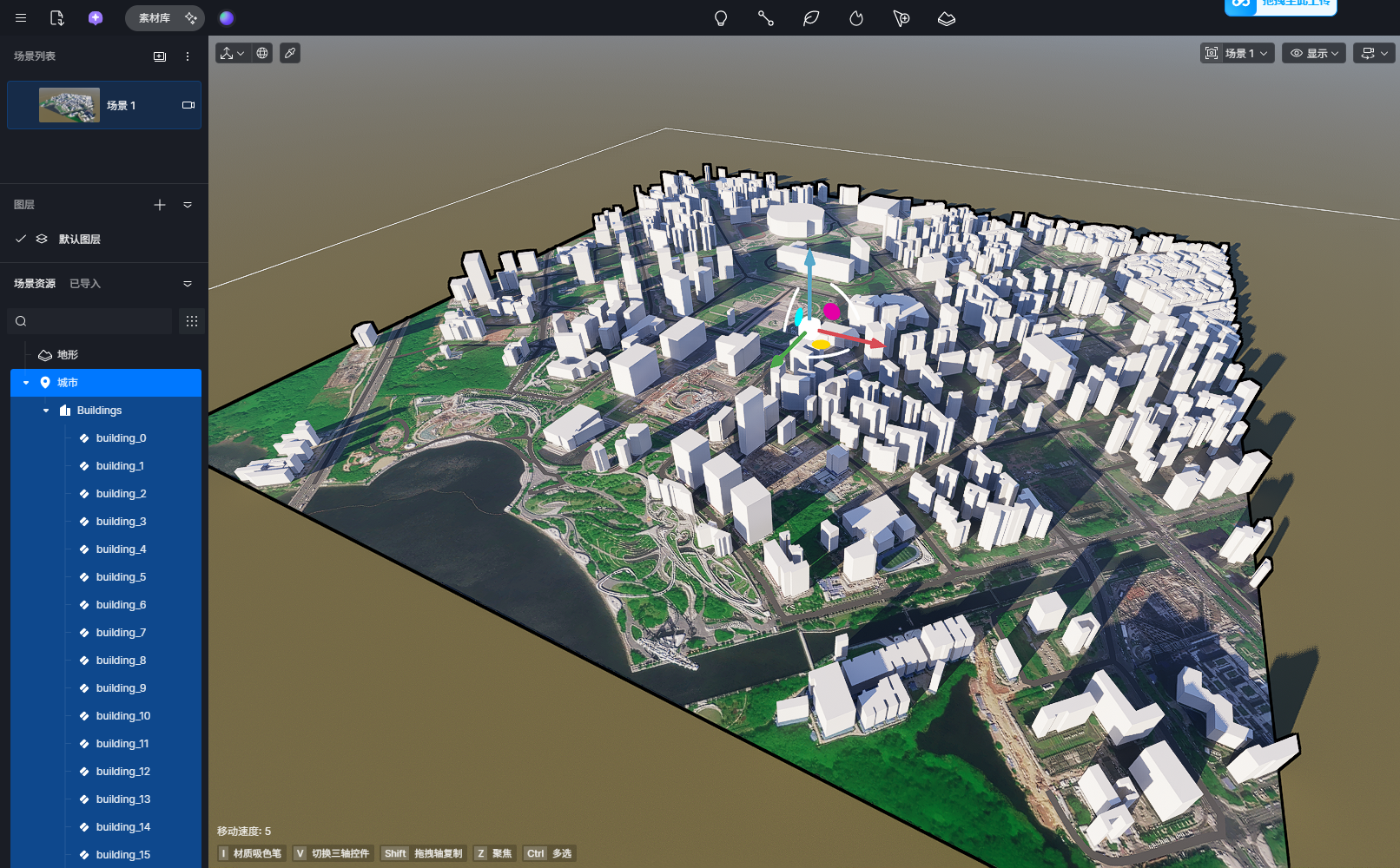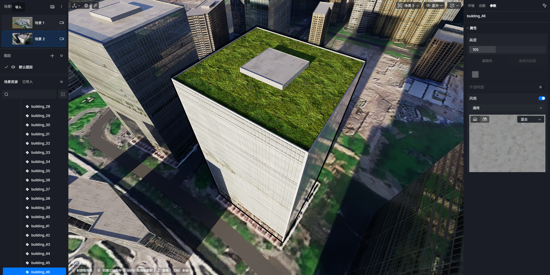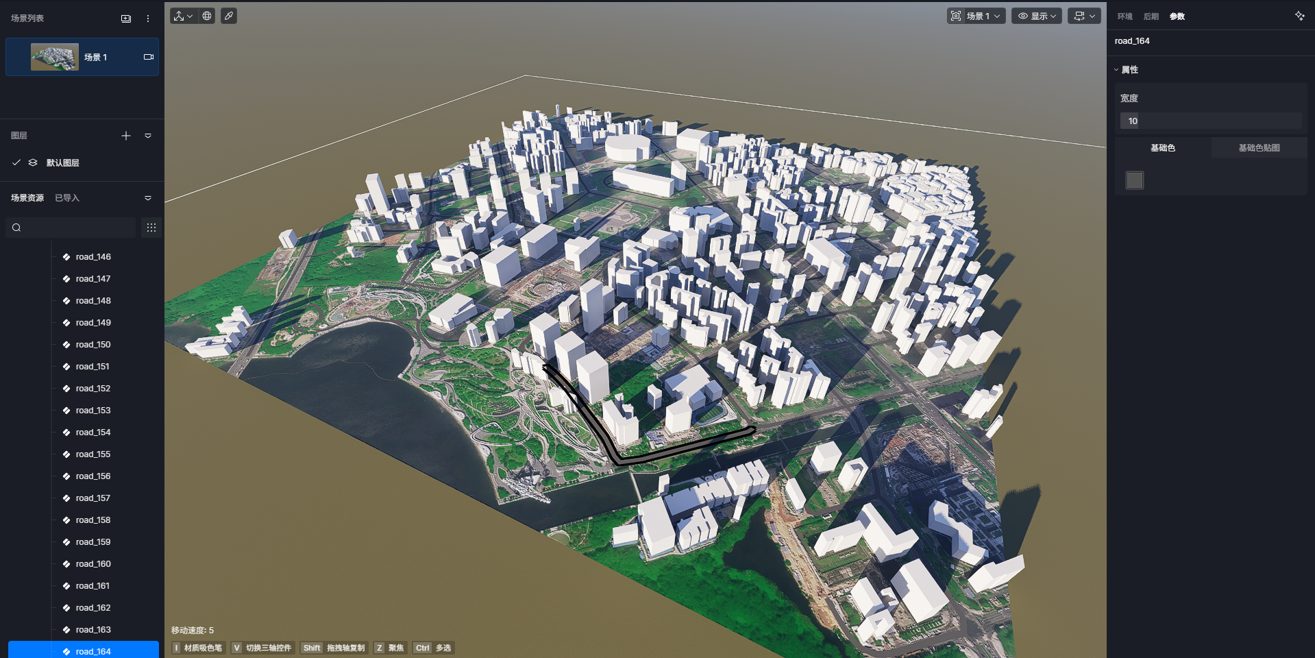 - 导入的每个文件作为一组,分为建筑、道路和其他三种类型存储在场景资源列表中,支持整组移动、旋转。