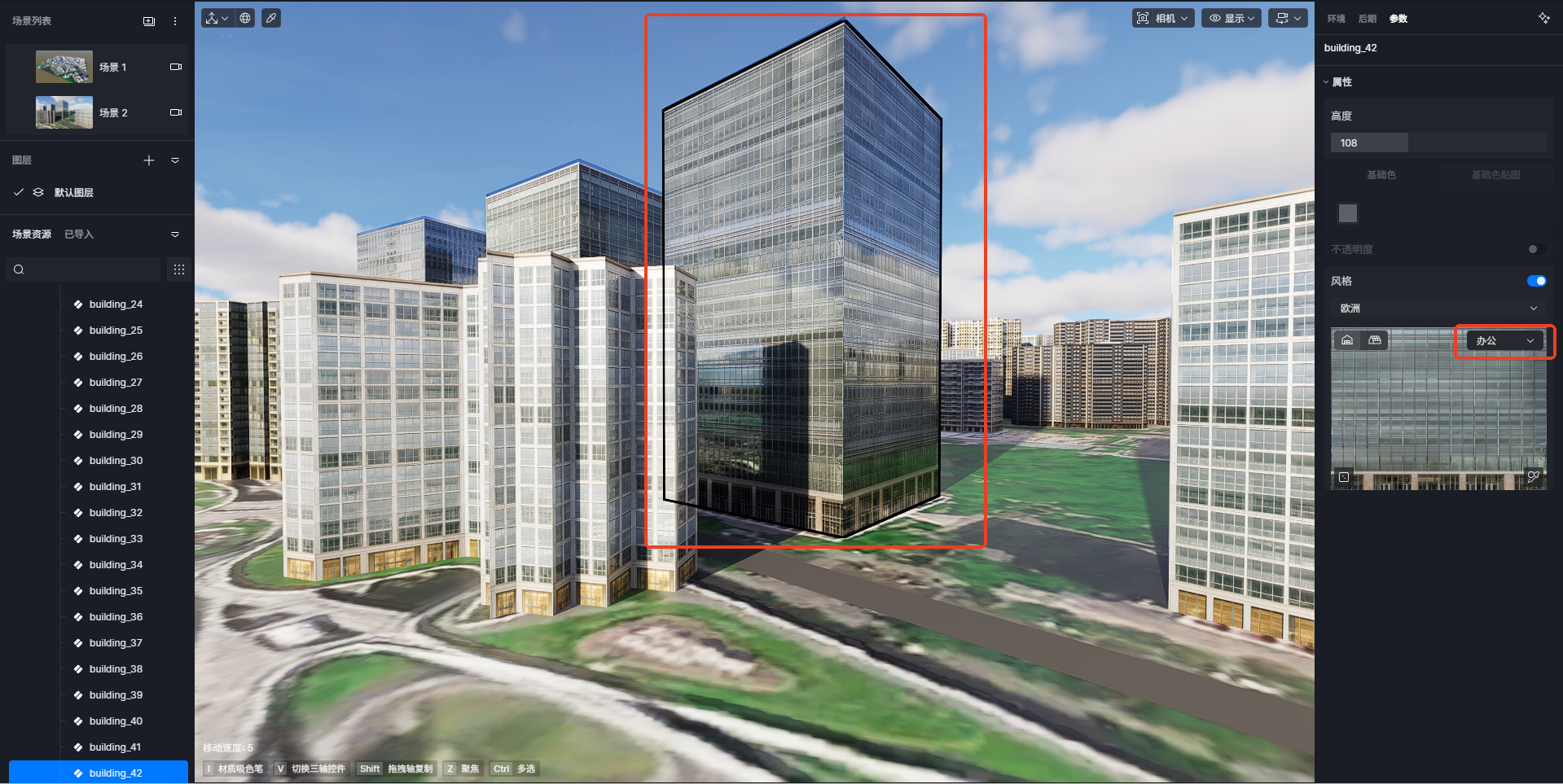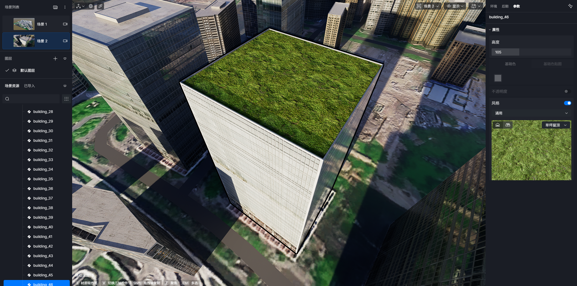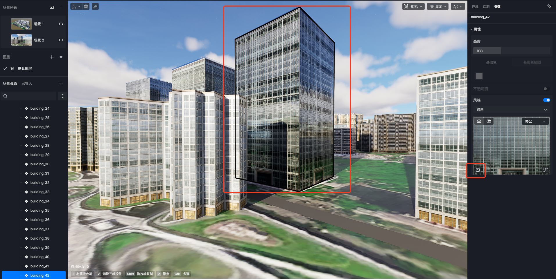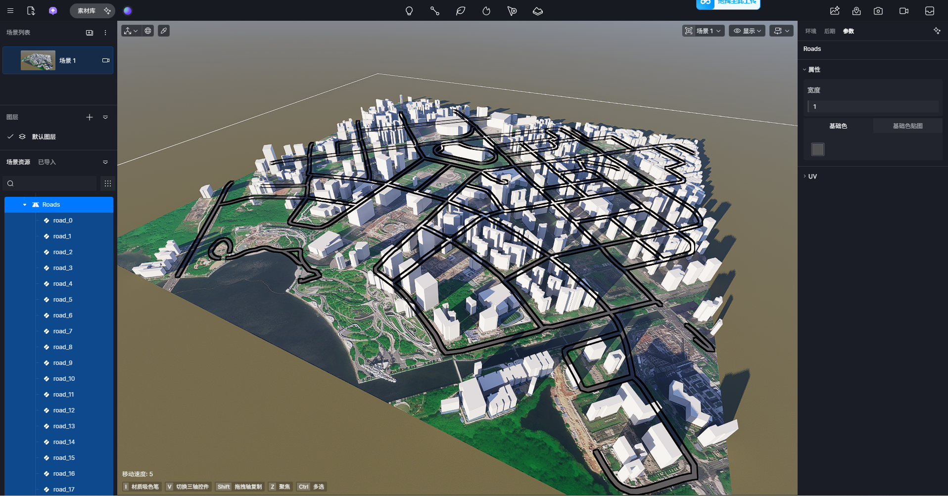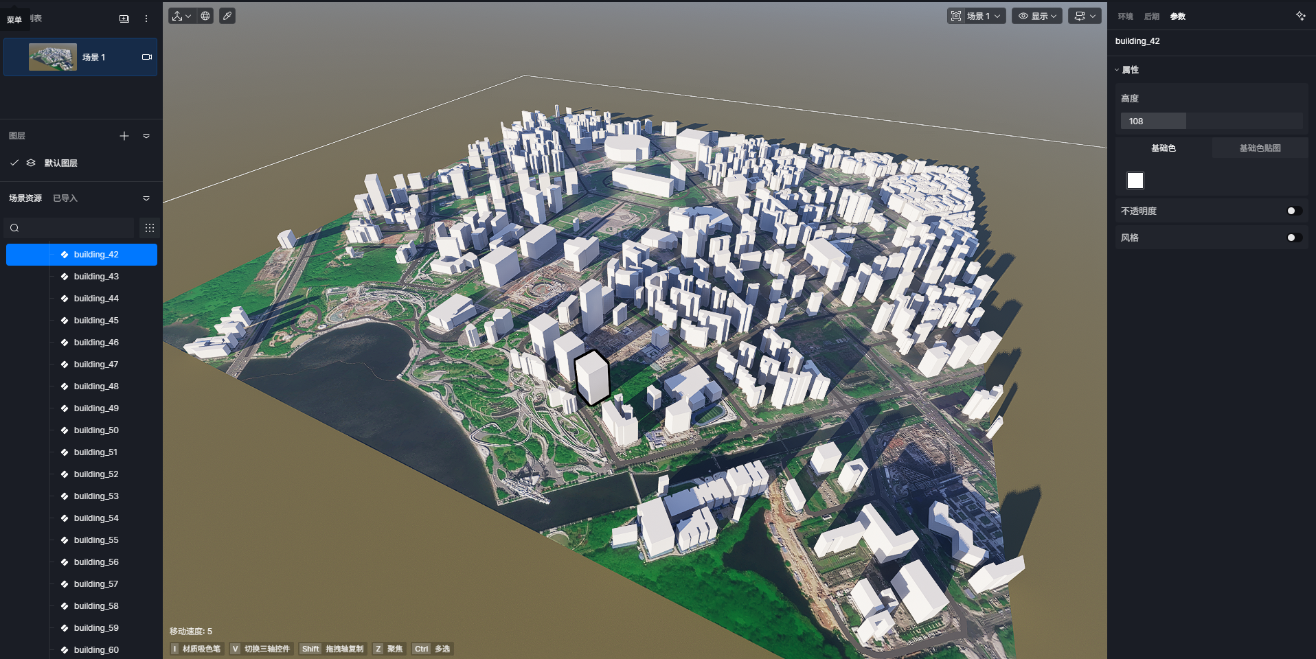 - 导入的每个文件作为一组,分为建筑、道路和其他三种类型存储在场景资源列表中,支持整组移动、旋转。