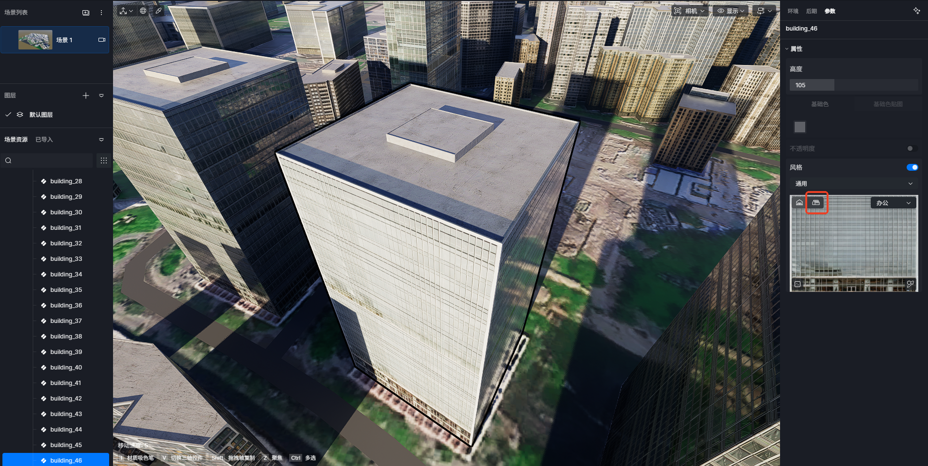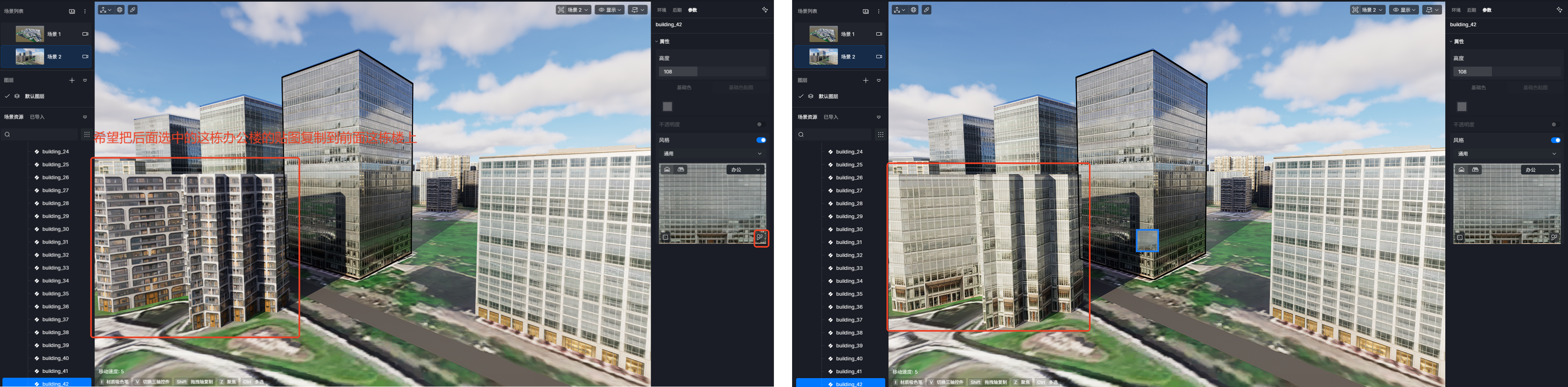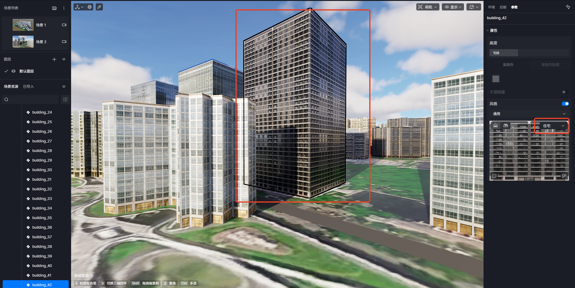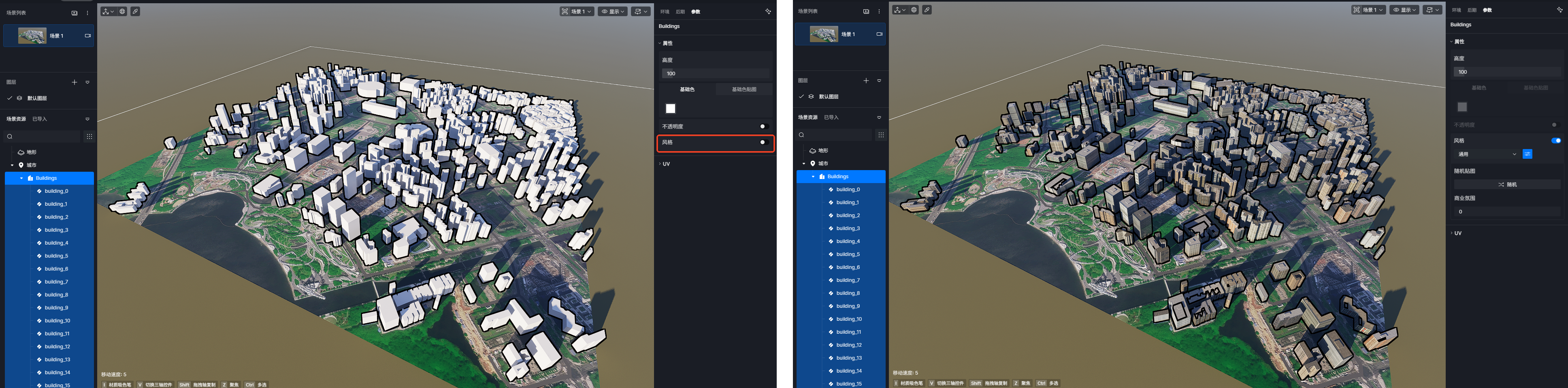您可以在选中建筑组时打开右侧边栏的风格开关对整个建筑组赋予风格材质,也可以在选中单个建筑时对单个建筑赋予风格材质。