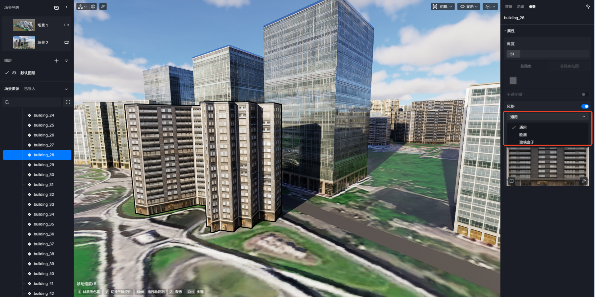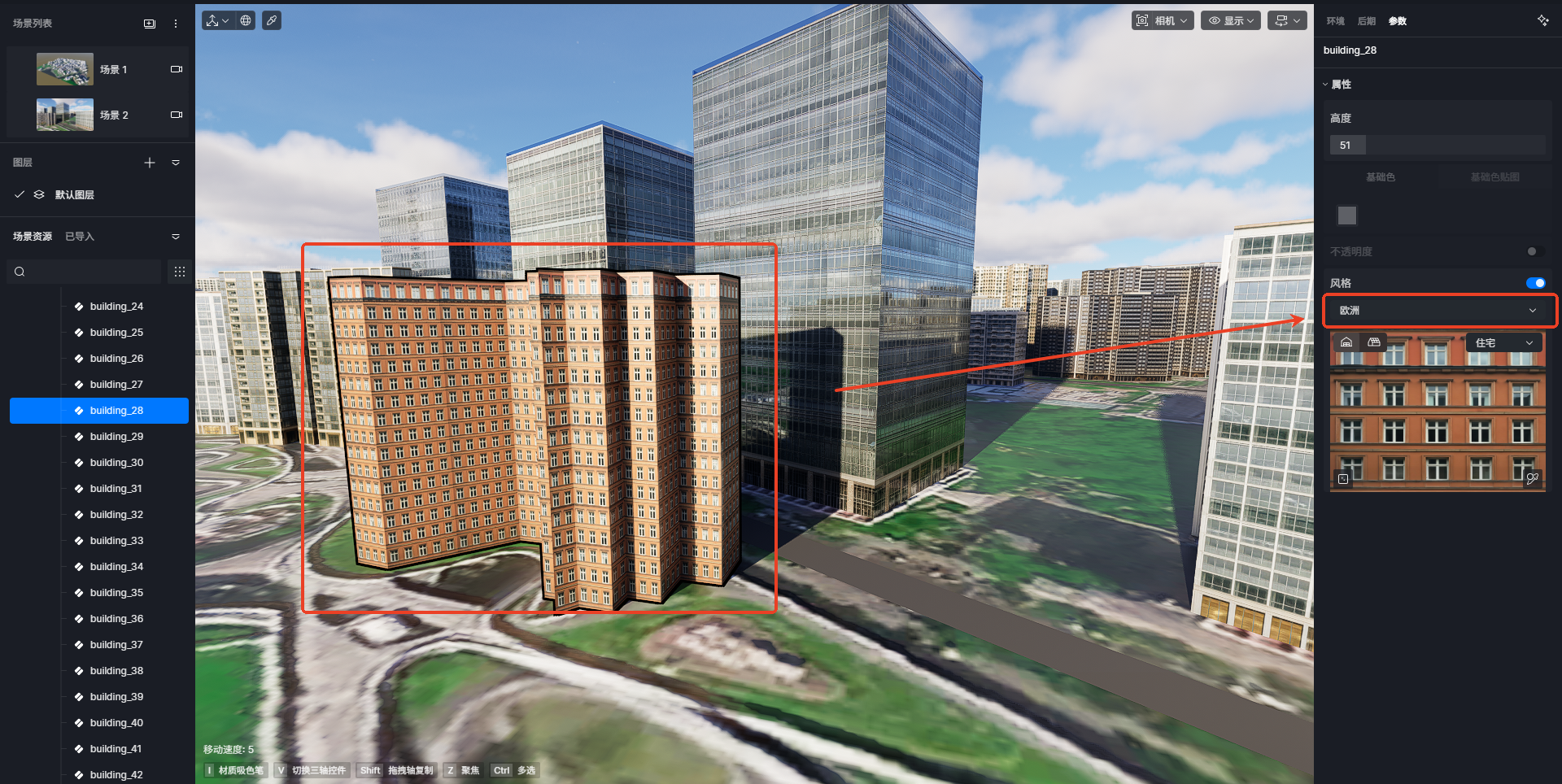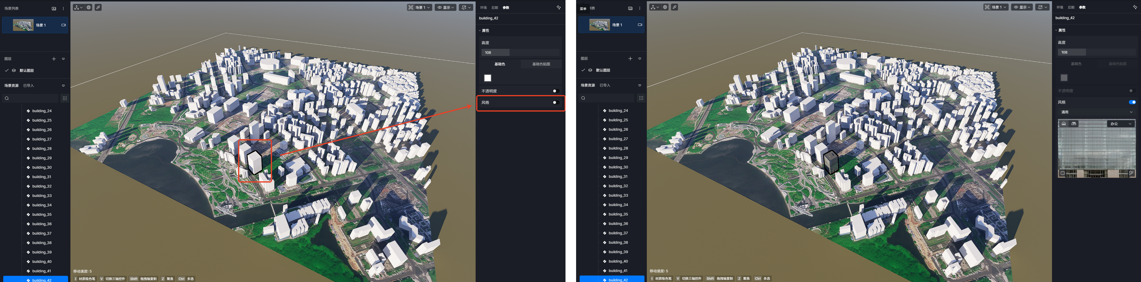 选中单个建筑,开启“风格”开关--->可切换不同风格的材质