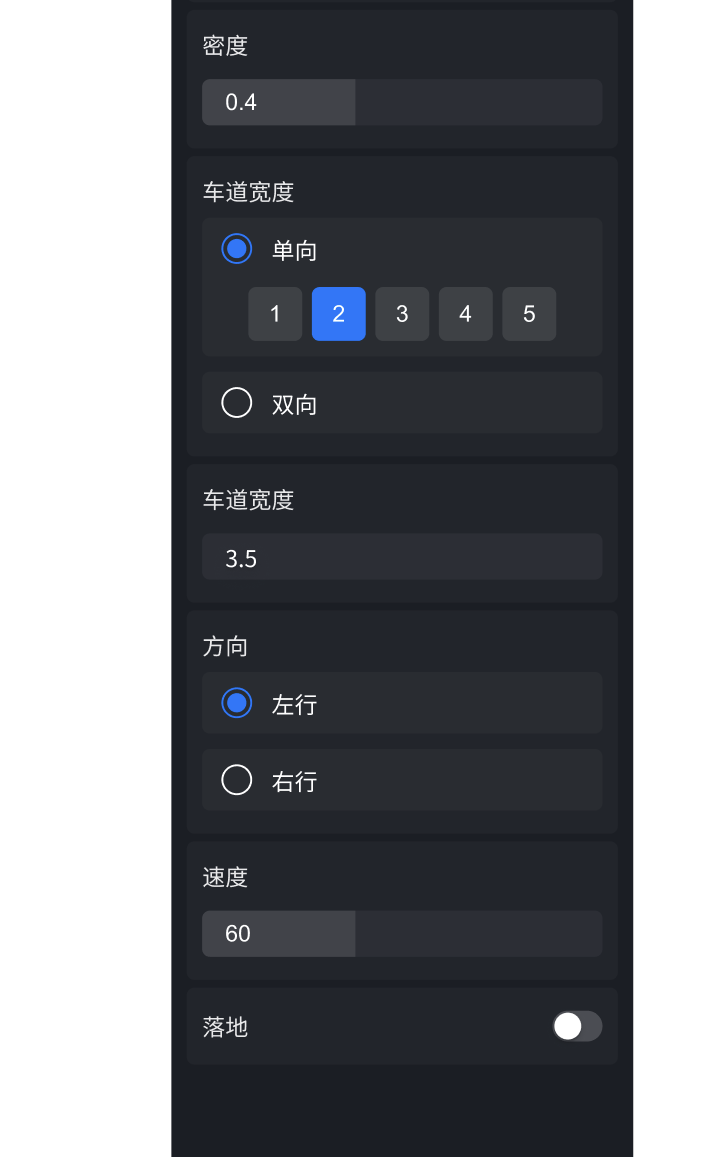 “车道宽度”与真实数据对应,单位是“米”。默认宽度为 3.5 m,可调整范围是 3m~5m