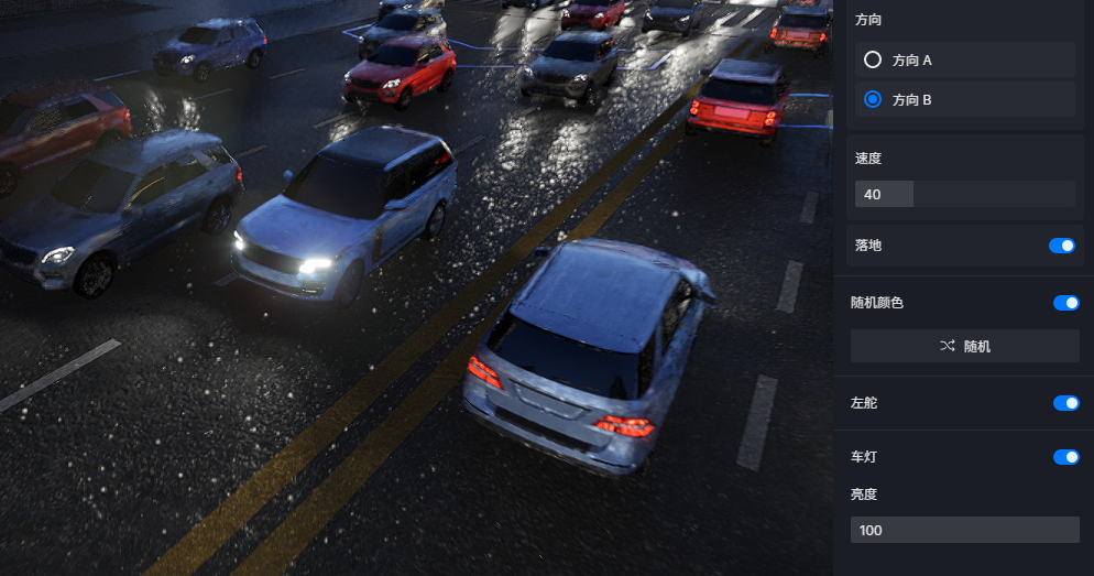 车辆的左右舵参数,支持设置路径上的车辆随机颜色,统一开关车灯。