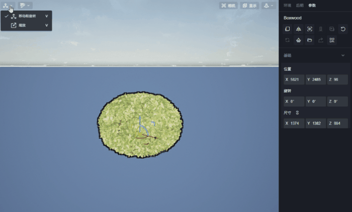 导入场景中的模型,在非锁定状态直接用鼠标选中,可以使用“移动和旋转工具”,在场景中更改模型的坐标和旋转角度。坐标轴中心的默认位置为模型底部的中心。