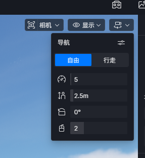 调节镜头实际视点距离场景原点坐标水平面的垂直高度,行走模式-镜头高度的滑竿值域范围为 0.8m-2.5m,不支持手动输入更大值。