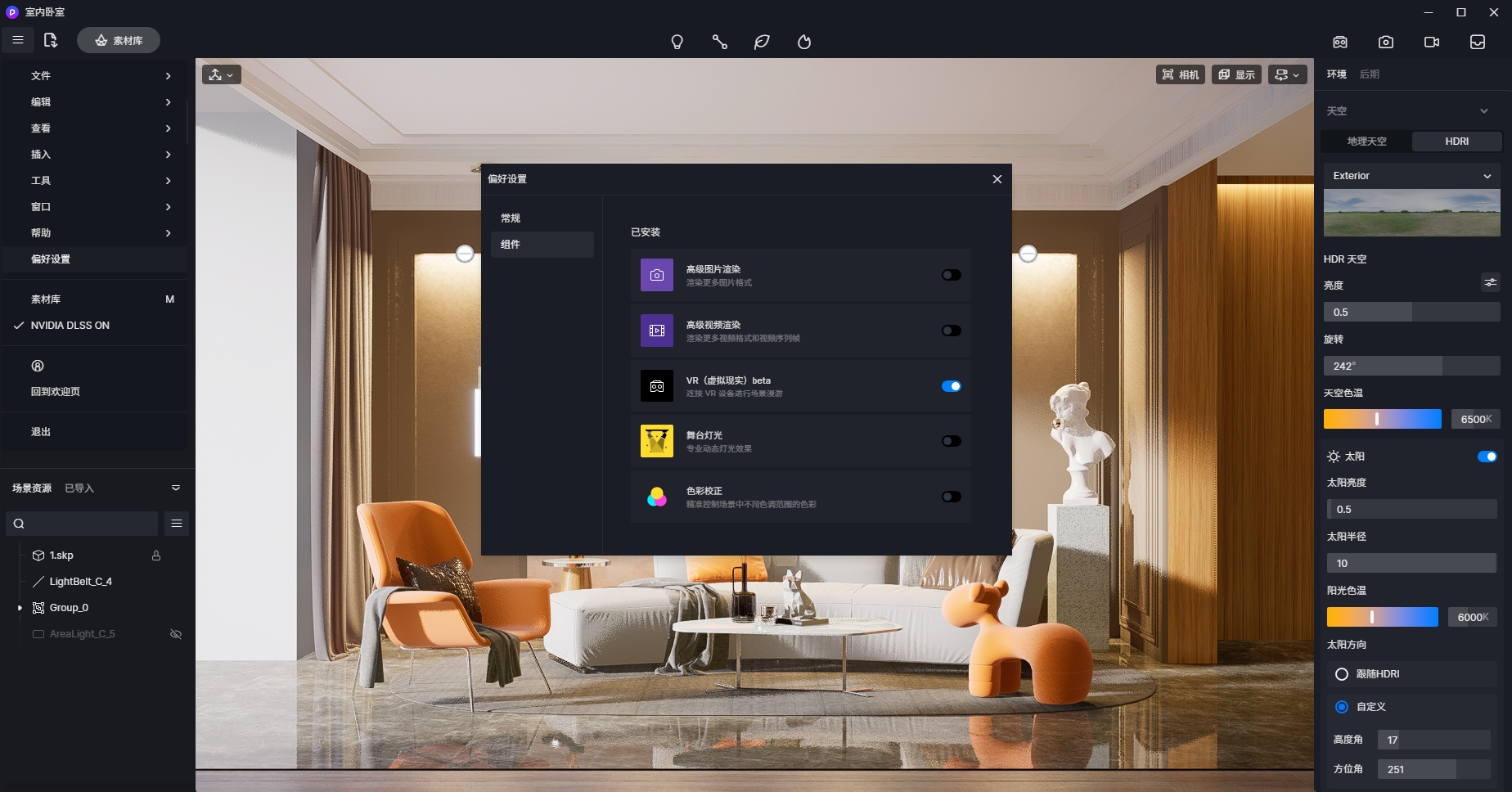 「D5组件」是基于D5渲染器简洁的本体之上,用于实现高级功能延伸的一系列扩展模块。在“菜单” -> “偏好设置” -> “组件”中,可以查看当前已有的组件,一键开关,管理组件的状态。