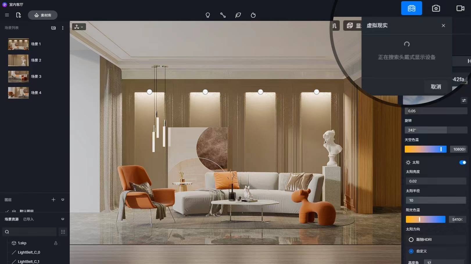 综合性能、效果、用户体验等多方面考虑,我们设计了当前的 VR 预览画质,介于高画质与中画质之间,包含 GI 和阴影效果,但无反射,我们会不断优化,带给用户更好的体验。