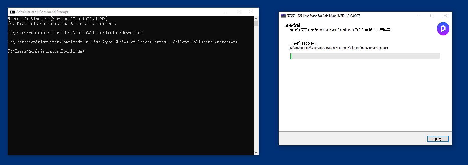 下图中,使用命令行命令安装3ds Max-D5 实时同步插件,插件下载位置在 C:\Users\Administrator\Downloads 。